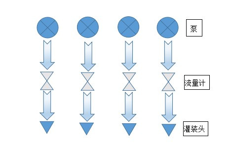 我們再來看一下這種一頭一泵的灌裝流程圖,同樣以四頭灌裝機為例: